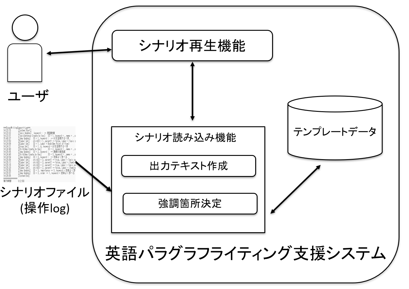 その操作logをシナリオとしてシナリオ読み込み機能で読み込み、テンプレートデータを用いてlogに対応するチュートリアルを自動生成し、チュートリアルとしてシナリオ再生機能でユーザに出力します。 これにより、授業に合わせたチュートリアルのカスタマイズが可能になりました。